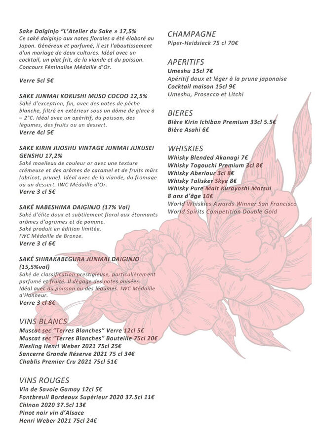 Notre menu propose un large choix de plats traditionnels tels que des sushis, sashimis, makis et autres spécialités de la cuisine japonaise. Les ingrédients frais et de qualité supérieure sont soigneusement sélectionnés par nos chefs talentueux, qui travaillent avec passion pour offrir des plats savoureux. Notre service est impeccable, et nos serveurs sont attentionnés, créant ainsi une expérience gastronomique de qualité supérieure.